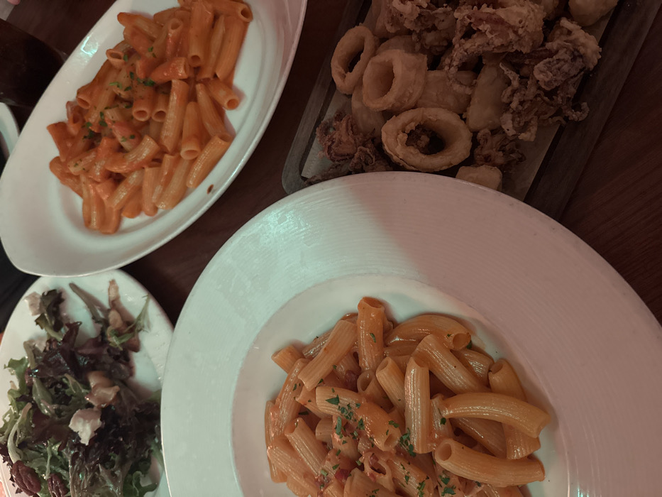 A table setting features three dishes. Two white plates hold penne pasta with a creamy tomato sauce, garnished with parsley. A smaller plate displays a mixed green salad with feta cheese and pecans. Fried calamari is arranged on a wooden board, partially visible. The composition suggests a shared meal or appetizer selection.