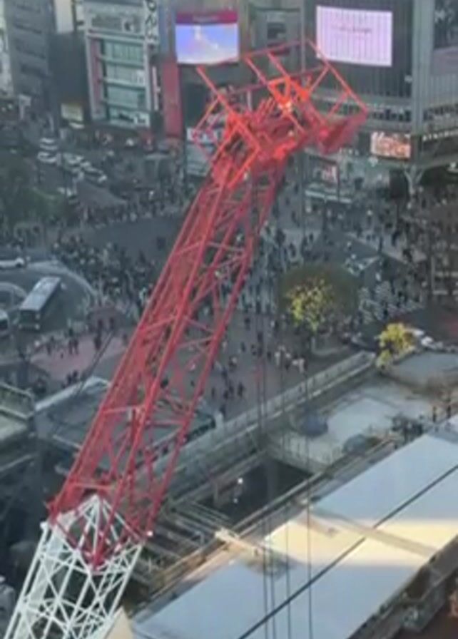 view of Shibuya Crossing in Tokyo, Japan, from a high vantage point. A large construction crane, painted white and red, dominates the foreground, with its boom extending over a construction site. In the background, the famous pedestrian scramble crossing is visible, filled with many people crossing the street. Buildings surround the crossing, displaying various advertisements and signs. The scene is captured during daylight hours.