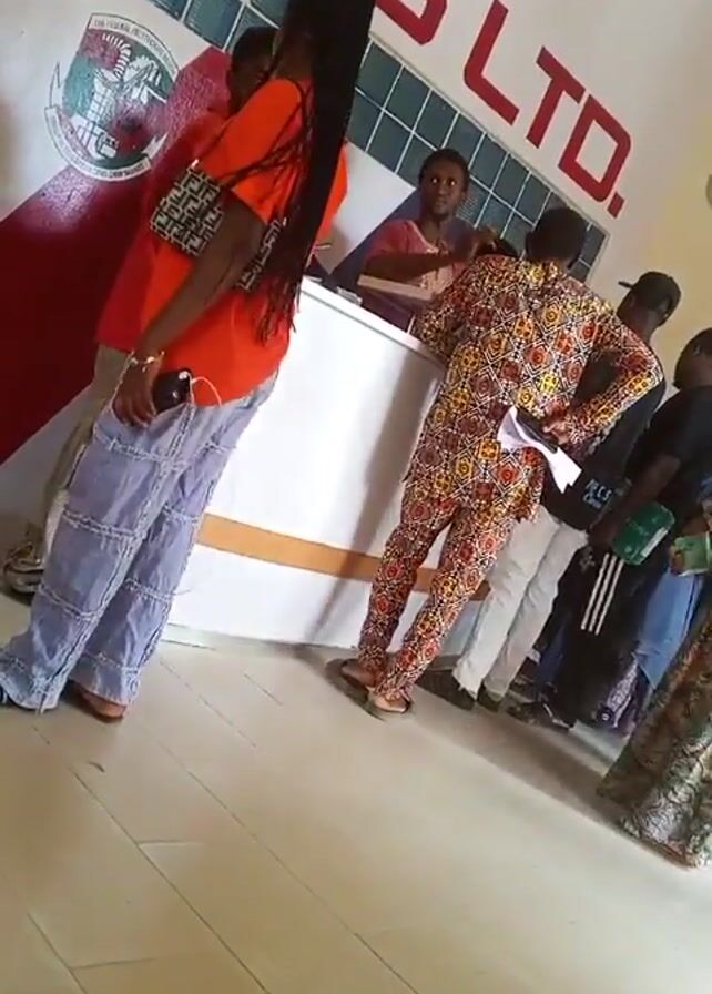People are standing in a line inside a building, waiting at a counter. The background has a sign on the wall that reads "ICS LTD". The people are dressed in a variety of casual clothing. Some of them are holding papers. The floor is tiled.
