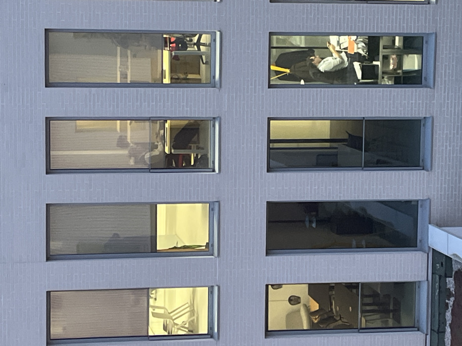 The image displays a segment of a modern building facade in Villeneuve-d'Ascq, France, constructed with light-grey or off-white rectangular brickwork. Eight rectangular windows, uniformly sized and framed in dark material, are arranged in two horizontal rows of four. Internal spaces are illuminated with warm yellow light. A white horizontal ledge is visible at the bottom of the image. **Top Row, left to right:** 1. The leftmost window's upper half is obscured by a light-colored roller blind. Below, a brightly lit room contains two white chairs with metal frames, one upright, the other partially visible. No individuals are present. 2. The second window is partially covered by a light-colored roller blind. The brightly lit interior appears unoccupied, with a faint, dark silhouette discernible behind the blind. 3. The third window reveals an individual, appearing to be male, seated at a light-colored desk in a brightly lit room. The person, wearing a light-colored shirt, is engaged in an activity, possibly viewing a screen. A dark office chair is positioned at the desk. 4. The rightmost window shows an unoccupied, brightly lit room containing a light-colored desk and a dark office chair. **Bottom Row, left to right:** 1. The leftmost window exposes a brightly lit room furnished with a curved-back chair, a dark table, and a pendant light fixture suspended from the ceiling. 2. The second window shows a dimly lit interior where a prominent dark, cylindrical object, possibly a lamp, is centered. The room appears otherwise empty. 3. The third window displays a brightly lit room containing a dark chair and a partial view of a table. 4. The rightmost window clearly depicts an individual, appearing to be male, wearing a light-colored shirt and seated at a desk. The person is focused on an object on the desk. Behind the individual, a dark jacket and a yellow item, possibly a garment or bag, hang from a fixture. The room is brightly lit, with multiple items present on the desk surface.