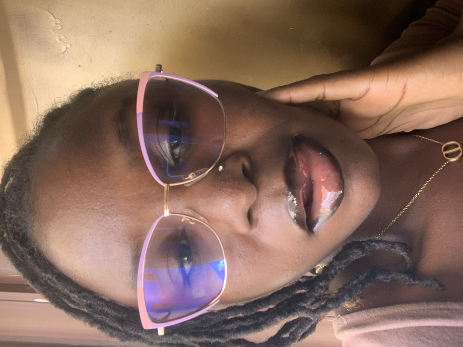 A close-up, head-and-shoulders portrait of an individual with dark skin, assumed to be in Tempure, Nigeria, is depicted. The individual faces the camera directly, wearing light pink and purple cat-eye eyeglasses with gold-toned metal accents; blue and white light reflections are visible on the lenses. Dreadlocks or braids are visible on the left side of the frame. A small, metallic stud nose piercing is present on the right nostril. The individual's lips are coated with dark, glossy lipstick, featuring a lighter, possibly glittery, application along the inner edges, particularly on the lower lip. A gold-toned chain necklace with a "CD" or similar double-ring pendant is visible. The person wears a light-colored top, possibly beige or light pink, visible on the lower left. The right hand is positioned against the cheek and jawline on the right side of the frame. The background is out of focus, showing a blurry light brown or wooden surface on the left and a golden-yellow wall with minor surface imperfections on the right.