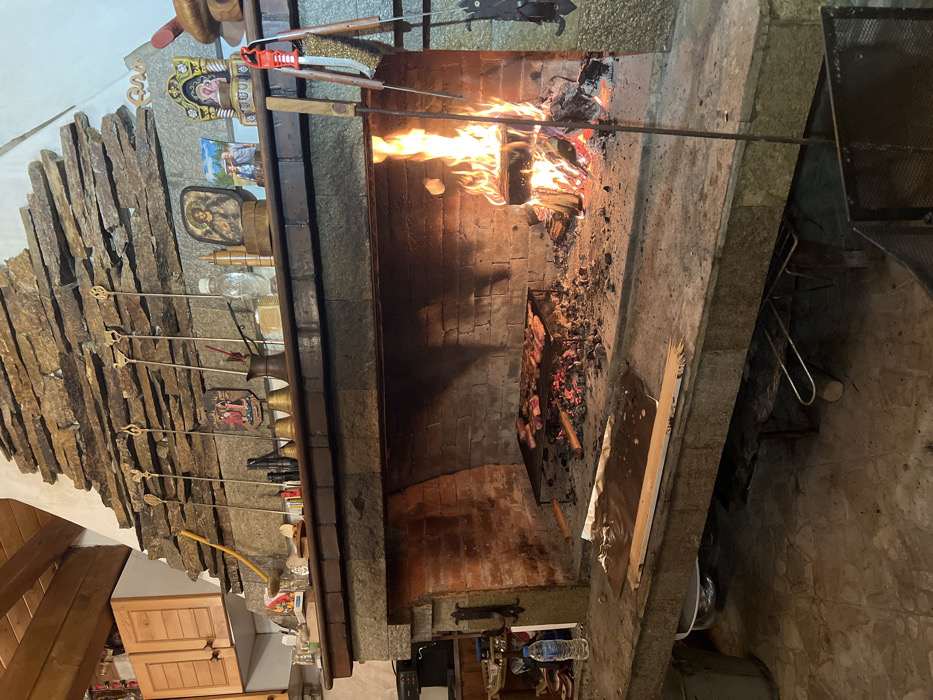 The image depicts an indoor, active cooking scene within a residential or public establishment in Chepelare, Bulgaria. A large, rustic fireplace constructed from a grey stone base and an arched brick firebox dominates the view. The chimney breast above the dark wooden mantle is faced with irregular, stacked natural stone slabs. Inside the firebox, a vibrant wood fire burns on the right, casting bright orange flames. To the left of the fire, several pieces of meat, appearing to be steaks or chops, cook on a metal grill rack positioned over glowing embers and ash. The wide stone hearth extends forward, serving as a preparation surface. On the left side of the hearth, a plastic water bottle stands near a partially visible grey bucket and a dark object. In the center, a crumpled piece of aluminum foil and a broken wooden plank fragment lie on the stone. On the right, long metal fireplace tools, including a poker, are positioned upright. A dark, metal mesh screen is partially visible on the bottom right. The mantlepiece above the firebox displays various decorative and functional items, including several religious icons (e.g., Christ Pantocrator, Madonna and Child), a framed photograph, small brass bells, a traditional copper coffee pot (cezve), another clear plastic water bottle, and a wooden sculpture. Above the mantle, additional long, metal fireplace tools with decorative finials are mounted vertically against the stone chimney. In the upper left background, light-colored wooden ceiling beams and wooden cabinets with two doors are visible. The floor is covered with large, irregularly shaped tiles in various shades of grey. No individuals are present in the immediate scene.
