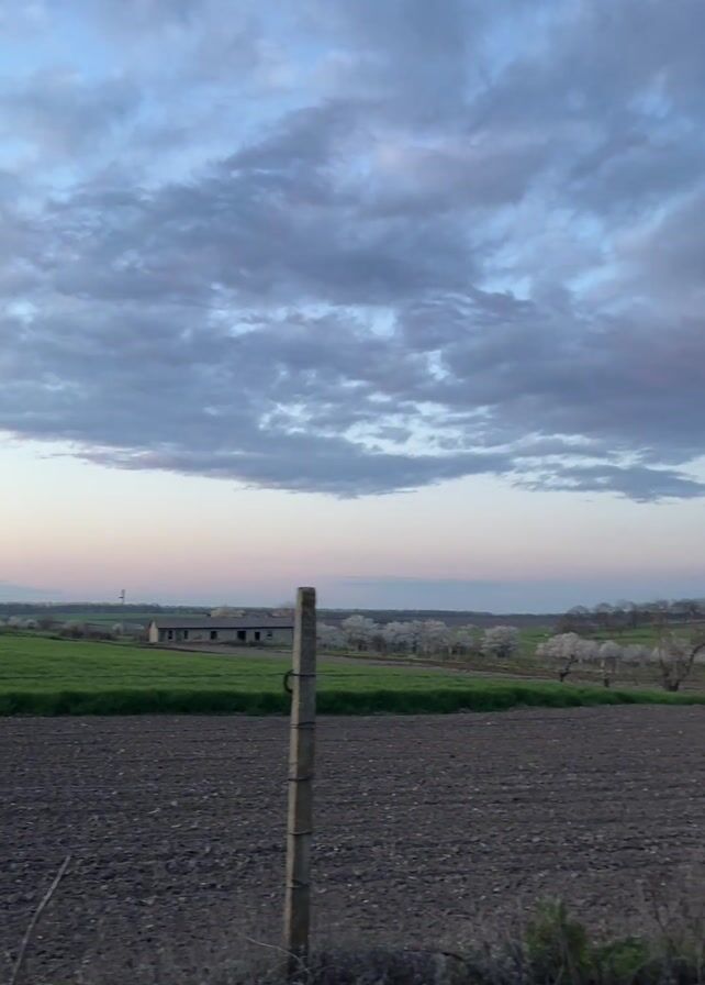 landscape of fields under a cloudy sky. A freshly tilled field in the foreground transitions to a field of green crops in the midground. Behind these fields, a row of trees with white blossoms can be seen, along with a small brick structure with a dark, slanted roof. A wooden fence runs along the edge of the foreground field. The sky is filled with clouds in shades of grey, with a hint of pink near the horizon.