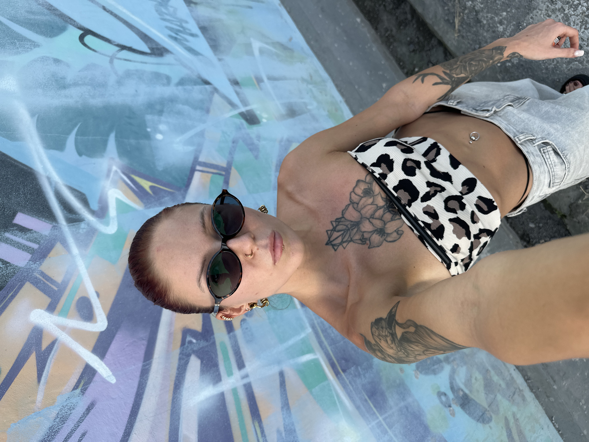 A woman with fair skin is lying on a graffiti-covered surface, appearing to be a skateboard park or similar public area in Tibubeneng, Indonesia. She is positioned at an angle to the camera, wearing a black and white animal print top and light-colored denim shorts. She has tattoos on her chest, stomach, and arms. She wears dark sunglasses and a ring in her nose, as well as jewelry in her ears. The graffiti under her is a mix of colors, including blue, purple, and white. Some sort of concrete or stone structure is visible on the right side of the frame.