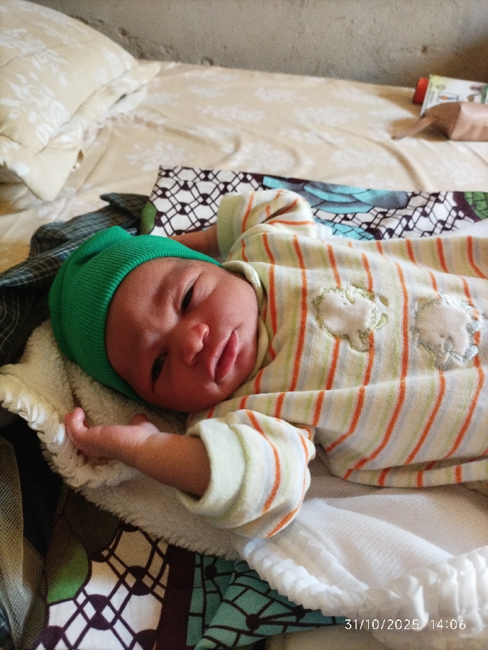 An infant is positioned on its back in an indoor setting within Pantame, Nigeria. The individual wears a bright green ribbed beanie and a sleepsuit featuring light green, orange, and white horizontal stripes with two light-colored, possibly embroidered, shapes on the chest. The infant's skin tone is dark, its eyes are partially open looking towards the camera, and its mouth is slightly parted. It rests on a white, soft blanket, which is placed over a patterned fabric displaying dark green/blue and white/light blue geometric designs. This arrangement lies on a bed covered with a light beige sheet adorned with a subtle white floral pattern. A beige patterned pillow is visible in the upper left background. The background wall consists of a light-colored, textured surface. In the upper right background, an orange-capped container and a brown folded object are discernable on the bed. A timestamp "31/10/2025 14:06" is present in the lower right corner of the image.