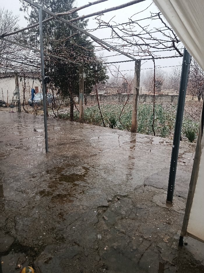The scene depicts an outdoor area in Unknown, Unknown, during light snowfall. The foreground features a wet, cracked concrete surface with numerous puddles, reflecting the overcast sky and ambient light. A partial view of a spherical object, yellow and green in color, rests on the ground at the lower-left edge. In the midground, a pergola structure composed of metal beams and vertical posts (some concrete, some metallic) spans the area, with bare vine branches overhead. A white fabric element partially obscures the right side of the pergola from the viewer's perspective. Behind the pergola, a dark green evergreen tree stands prominently. To the left in the background, a light-colored building or wall is visible, with a blue tarp-covered object (possibly a vehicle or equipment) positioned in front of it. A metal sink or basin unit is situated next to the blue object. To the right of the pergola and behind the tree, a field of low-lying, dormant green vegetation extends towards a grey concrete wall that marks a distant boundary. Beyond this wall, numerous bare deciduous trees are visible against a light, overcast sky. Snowflakes are evident throughout the image, visibly falling and accumulating lightly on surfaces, indicating ongoing precipitation and cold ambient temperatures. No people are present.