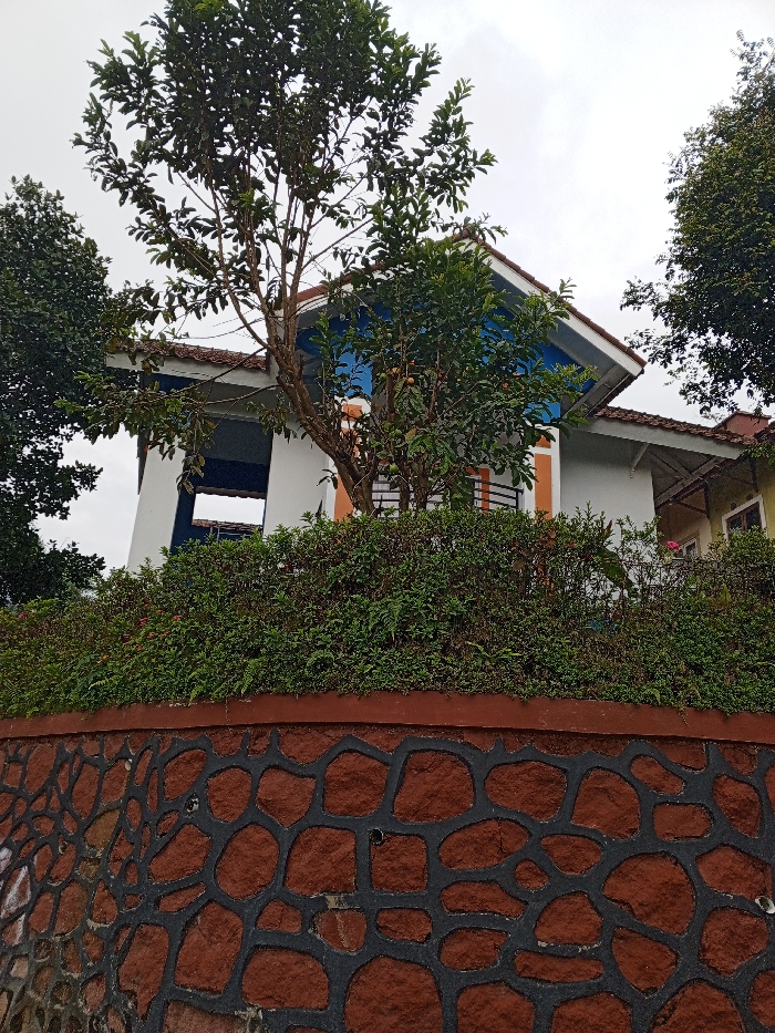 A white house with a blue trim peeks from behind a dense green hedge and several trees. The house has a brown tiled roof and orange accents. Below, a wall composed of large, rounded red stones outlined in black supports the foliage. The sky is overcast.