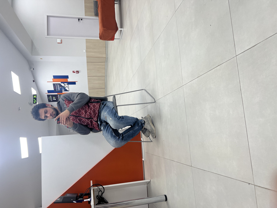 The image depicts a modern, well-lit indoor public facility in Tbilisi, Georgia, characterized by minimalist design. A single male individual, appearing to be in his late 20s to early 30s, is seated on a grey metal-framed chair in the center of the frame. He has dark, short curly hair and a beard. He is wearing a grey hooded sweatshirt over a dark red patterned vest, distressed blue jeans, and grey athletic shoes. His attention is focused downward on a black smartphone held with both hands. To the left of the seated man, a white stand with a chrome-like cylindrical leg supports a black monitor or device with visible cabling. Behind this, an orange diagonal wall section transitions to a white wall. The background features white walls, with light wood-toned paneling extending across the lower half of the right wall. Above the wood paneling, various vertical rectangular panels in blue, orange, and white, along with a darker panel containing text/graphics, are affixed to the wall. A red fire extinguisher is mounted on the wall below these panels. Near the ceiling, a green exit sign with a left-pointing arrow and small security cameras are visible. To the far right, a light-colored closed door with a dark handle is present. In the midground on the right, a low-profile, long bench or daybed covered in orange fabric with a white metal frame is positioned. The floor throughout the facility is composed of large, light grey square tiles, and the white ceiling features recessed rectangular fluorescent lighting fixtures. No other individuals or interactions are visible.