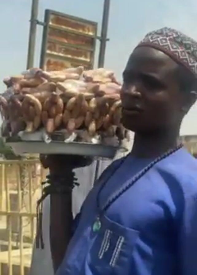 Here's a detailed description of the video: The video shows a young man, likely a street vendor, standing on a roadside. He is wearing a blue traditional outfit with a patterned cap and a necklace with a green pendant. He is holding a tray piled high with wrapped food items, possibly bread or pastries. Beside him is a stand covered with a gray cloth, upon which sits a bucket filled with what appear to be eggs. The background includes a rusty signpost, some greenery, and a building in the distance. The scene appears to be taking place outdoors on a sunny day.