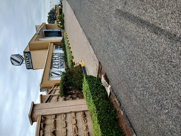 An exterior long shot captures the entrance of Zetech University in Witeithie ward, Kenya, under an overcast sky