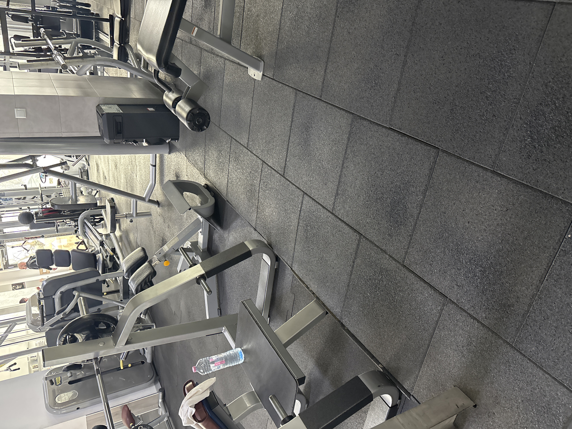 The image displays an indoor fitness center located in Kazanlak, Bulgaria. The environment is well-lit, with natural light potentially entering from a large window or reflective surface in the background. The floor throughout the visible area is covered with dark grey interlocking rubber tiles. In the left foreground, a section of a brown padded exercise machine bench is visible, with a white towel draped over its left edge. Adjacent to this, a clear plastic water bottle with a pink cap, containing a clear liquid and featuring a Bulgarian label, rests on a flat black platform of a silver-framed exercise machine. This machine appears to be a leg press or similar resistance training device, showing a black weight plate on a bar and a grey frame. In the midground, multiple pieces of gym equipment are arranged, predominantly with silver or light grey metal frames and black padded components. To the right of the central axis, a light grey tiled structural column stands, with a dark grey rectangular waste bin or utility cabinet positioned against its base. Another exercise machine with black padded rollers is partially visible in the mid-right. In the background, several individuals are present but largely out of focus. One bald man wearing a dark top is seen walking towards the right side of the frame. Other indistinct figures are visible amidst additional fitness equipment, including what appears to be cardio machines (e.g., treadmills or ellipticals) and weight stack machines. No specific actions or interactions are clearly discernible among the individuals.