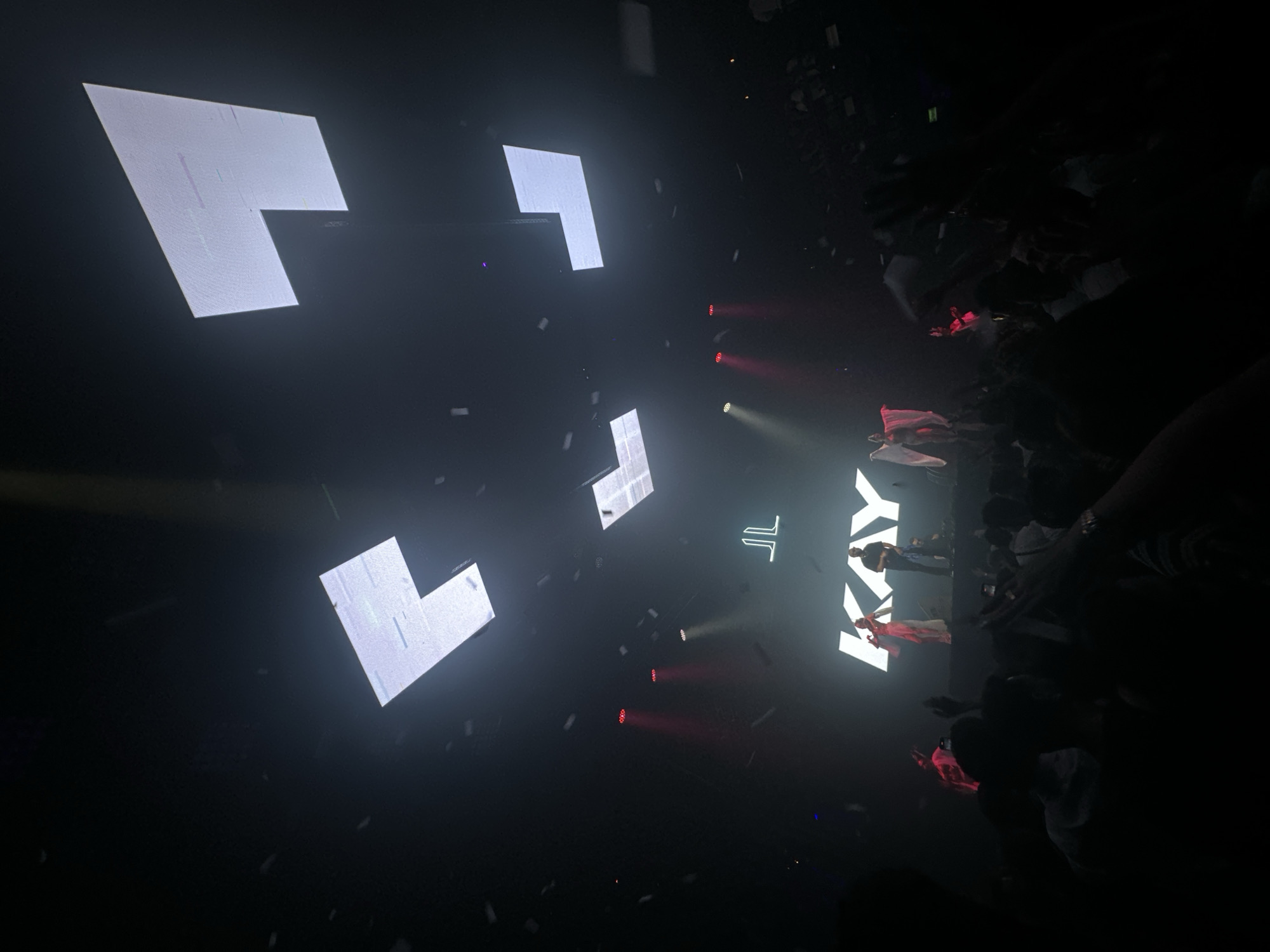The scene depicts an active nightclub event inside Illuzion Phuket in Patong, Thailand. A large, dark, indoor space is illuminated primarily by stage lighting and overhead displays. On a prominent stage, a large LED screen displays the word "KAY" in white capital letters, with a stylized "JL" logo visible above it. Three central performers are on the stage: one male in dark attire, positioned centrally, flanked by two individuals wearing flowing, light-colored garments. A fourth performer, partially obscured in red, is visible on the far left of the stage. Red and white spotlights project beams onto the stage area. Overhead, the dark ceiling features multiple large, irregularly shaped white LED panels. Small white confetti or debris particles are suspended in the air. In the foreground and midground, a dense crowd of patrons, mostly visible as dark silhouettes, watches the performance, with numerous hands raised, some holding mobile phones.