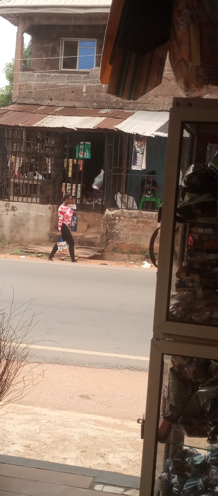 This image depicts a street scene in Umuoji, Nigeria, observed from inside a building or shop. In the midground, an asphalt road runs horizontally, bordered by a white line on its right edge and a reddish-brown dirt shoulder on its left. A person, dressed in a red, white, and black patterned long-sleeved top and black pants, walks left to right along the dirt shoulder, carrying a colorful bag in their left hand. Across the road, a single-story shop is visible, featuring a corrugated metal roof, part of which is reddish-brown and part silver. The shop's entrance is gated with dark metal bars. Inside the shop, merchandise hangs, including green and white plastic bags. Two individuals are present inside; one, possibly a child, is partially obscured by the gate to the left of the doorway, and another person sits on a green plastic stool to the right of the doorway, engaged with an object in their hands. The shop has a raised entrance with concrete steps. Above the shop, an unpainted two-story concrete building with visible blockwork features a balcony on its second level. A white-framed window with blue-tinted glass is present on this upper floor. Sparse green foliage is visible to the far left of the upper building. In the immediate foreground, to the bottom right, a segment of a display case or shelving unit is visible, containing various items. To the bottom left, a cluster of thin, dried plant stems protrudes. An overhead brown and green striped awning partially obscures the top right portion of the background building.