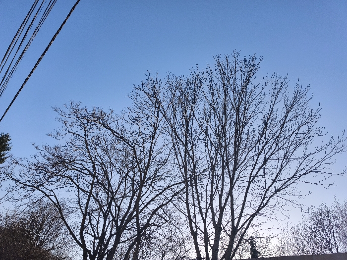 The image captures an outdoor scene in Sofia, Bulgaria, under a clear blue sky. Dominating the frame are several deciduous trees, silhouetted without leaves, indicating either late autumn, winter, or early spring. Multiple dark, parallel utility cables traverse the upper-left portion of the sky diagonally from the top-left corner. A patch of dark green foliage is visible on the far left edge, partially obscured by the cables. Along the bottom edge on the right, a dark, horizontal structure, resembling a rooftop or wall, is discernible, featuring a prominent dark, pointed finial or decorative element silhouetted against the lighter horizon. No human subjects, animals, or explicit actions are present.