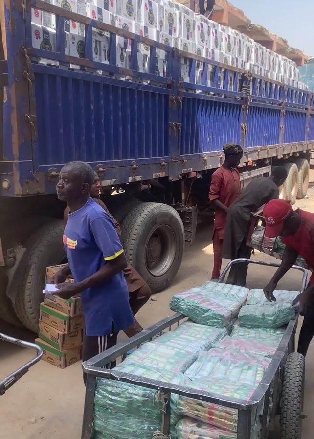 A large, blue truck with multiple boxes stacked high on the back is being unloaded by several men. One man is on top of the boxes. Others are on the ground taking boxes from the truck and loading them onto small, metal carts. One man sits on a stack of boxes with his arms crossed, holding a clipboard. The environment appears to be an outdoor market or storage area.