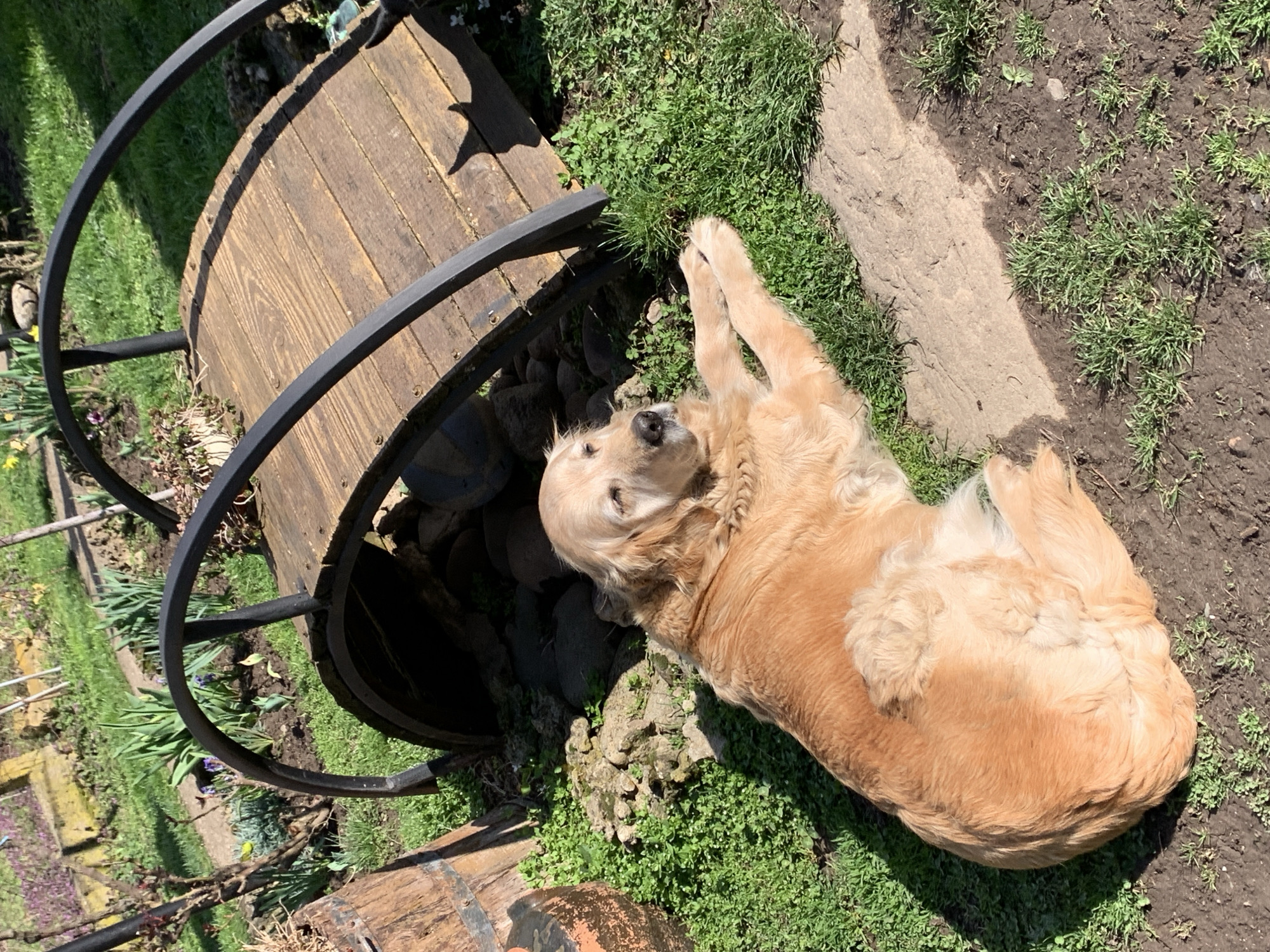A golden retriever dog with light golden fur lies on its side in a sunny outdoor garden or yard in Lehchevo, Bulgaria. The dog is positioned on a patch of green grass and exposed soil, facing slightly to the right with its eyes partially closed, appearing to rest or sunbathe. Its front paws are extended forward. To the left and behind the dog, a miniature decorative wooden bridge with black metal arching railings spans over an arrangement of rocks, suggesting a dry stream bed or decorative feature. Further left and partially visible are sections of wooden barrels or planters. The background features more green grass, various garden plants including some with early spring growth and sparse purple blooms, and bare branches of shrubs or trees. A segment of a light-colored, possibly concrete or stone, path is visible in the lower right foreground. Strong sunlight illuminates the scene, casting distinct shadows, particularly from the bridge and the dog.