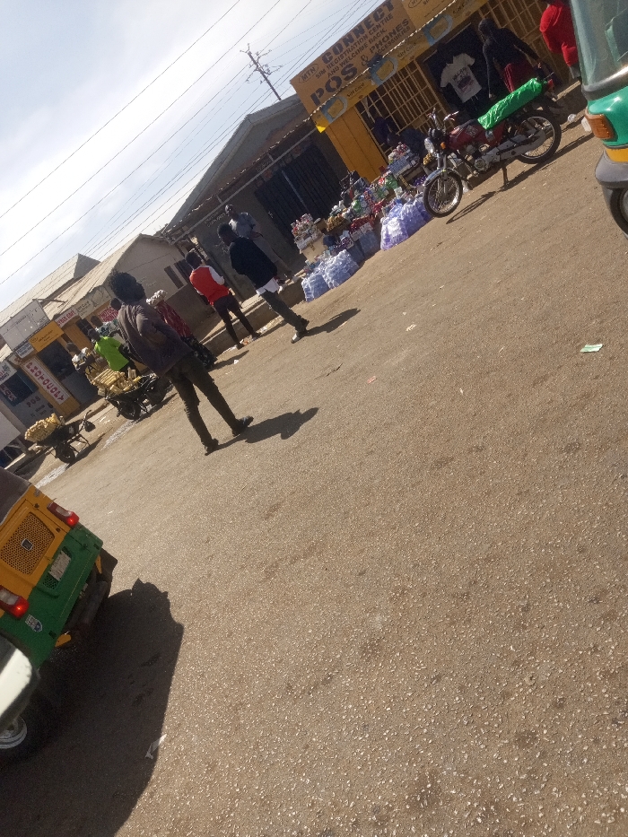 This image depicts a daytime street scene in a commercial area of Jos, Nigeria