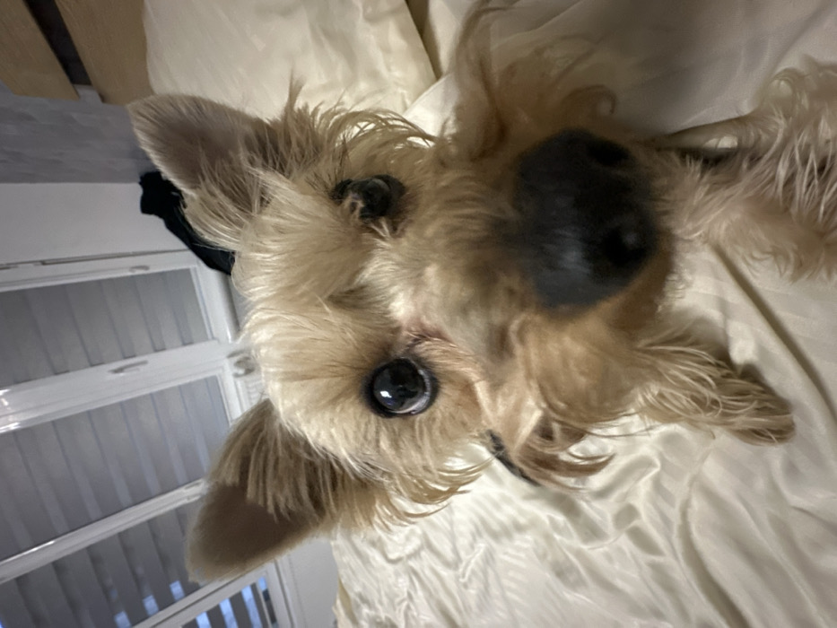 - "The scene captures a close-up, eye-level perspective of a small, light-brown canine, consistent with a Yorkshire Terrier or similar breed, positioned on light-colored, vertically striped bedding" by FM-vNohV2, licensed under CC BY 4.0