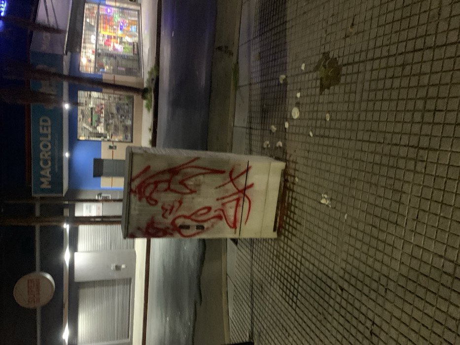 The image displays an urban street scene at night in Villa Bernardo de Monteagudo, Argentina. In the immediate foreground, a white utility box approximately 1.5 meters tall stands on a grey tiled sidewalk. The box is spray-painted with red graffiti depicting abstract, elongated figures. On the sidewalk around the box, several scattered, irregular white fragments, consistent with plaster or concrete debris, are visible, along with a dark, wet-looking stain on the tiles to the right. Across the asphalt street, two commercial buildings are present. The building on the left features a partially visible circular sign with "SUPER" written in red, and two storefronts secured by closed grey roller shutters. The adjacent building to the right has a light blue facade with a white sign displaying "MACROLED". Its large glass display windows are brightly illuminated from within, showcasing various merchandise. A second illuminated storefront is visible immediately to the right of the MACROLED building. Overhead artificial lighting illuminates the street and storefronts. No individuals or vehicles are visible in the scene.