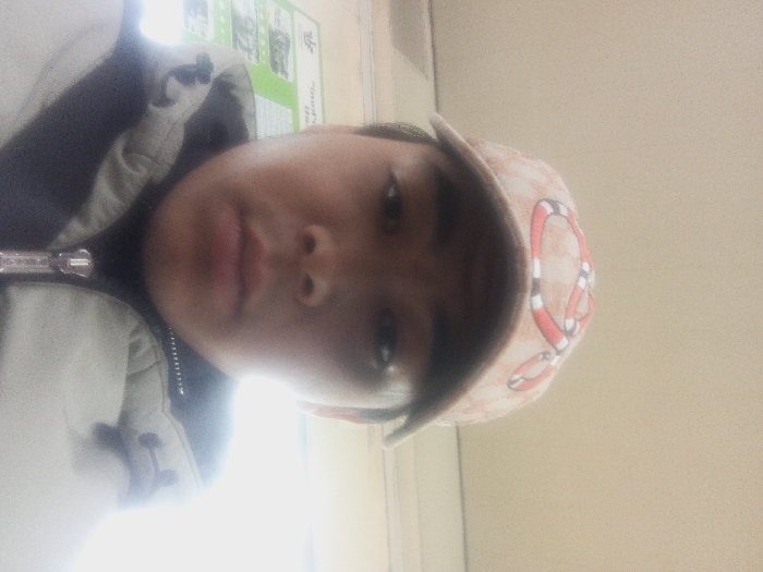A low-angle, close-up image captures a male individual, appearing to be of East Asian descent, looking directly at the camera with a neutral expression