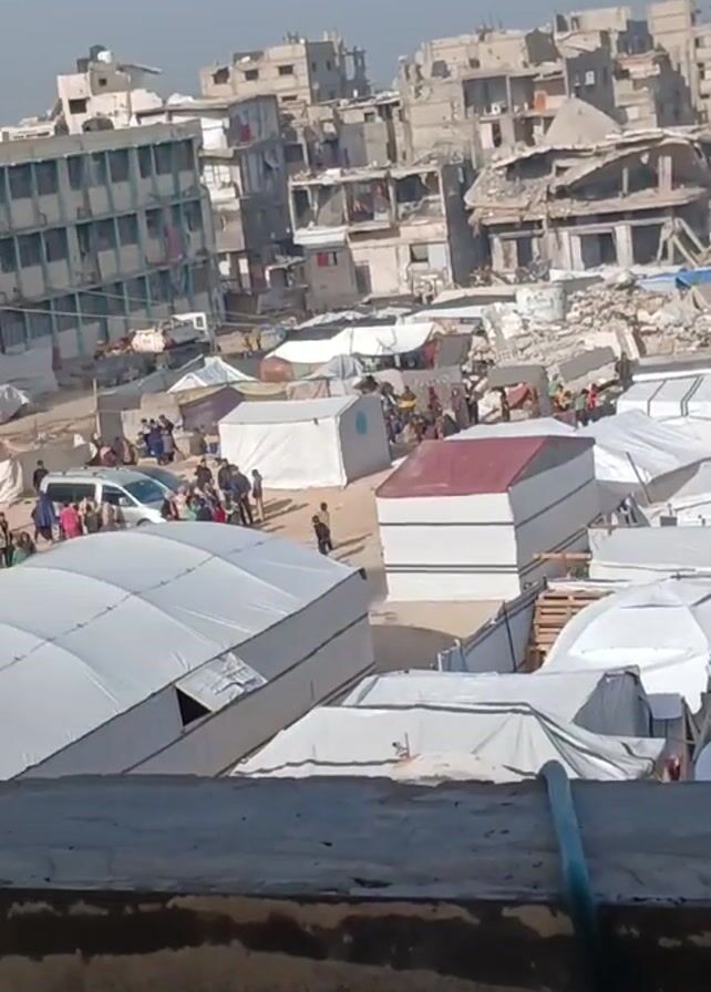 The video presents an overview of what appears to be a refugee camp or a similar settlement in an urban environment. The foreground is dominated by a multitude of white tents, arranged in a closely packed manner. In the background, buildings display signs of significant damage, with many appearing partially destroyed, suggesting the area may have suffered from conflict or a natural disaster. People can be observed walking around the camp, some appearing to be gathering or interacting in small groups. A van or similar vehicle is visible within the camp area. The video is taken from an elevated position, possibly a rooftop, providing a broad view of the settlement. The general ambiance suggests a scene of displacement and ongoing activity within the camp setting.