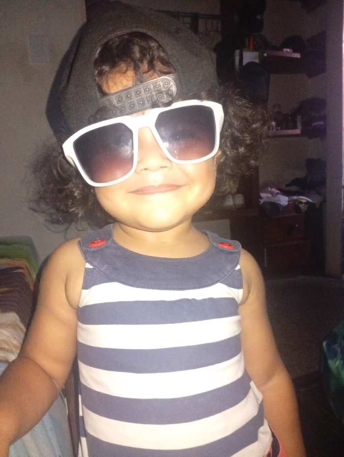A young child wearing a black baseball cap backwards and oversized white sunglasses smiles at the camera. The child wears a sleeveless shirt with blue and white horizontal stripes and two small red buttons on the shoulders. The background includes furniture, a wall, and bedding, all slightly out of focus. The lighting is somewhat dim, contributing to a casual, candid shot.