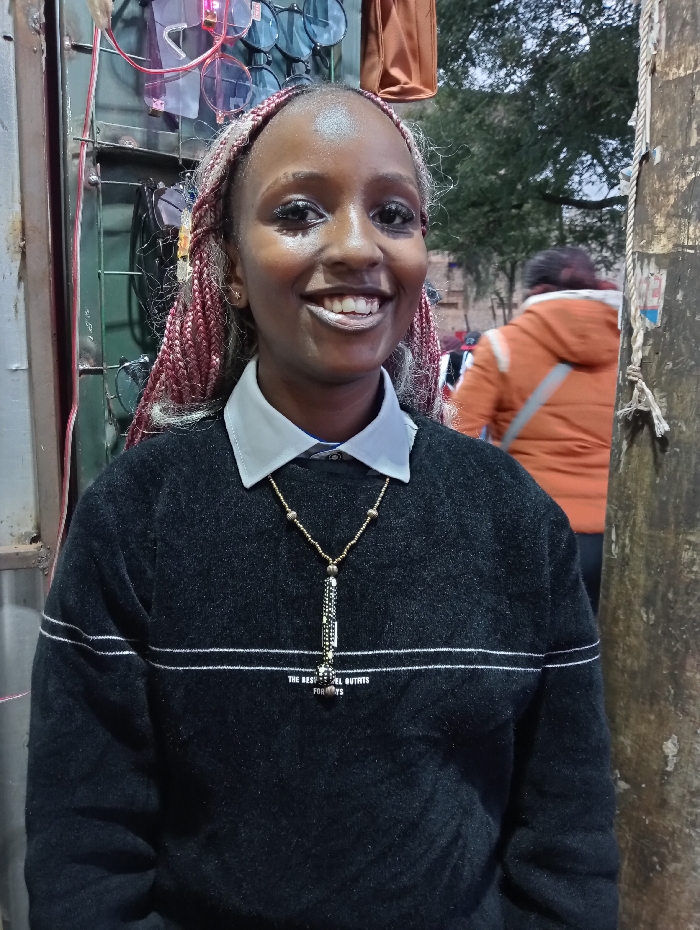 A smiling woman with red-streaked braids wears a black sweater over a collared shirt. She has a long, decorative necklace. Sunglasses hang on a display behind her. In the background, a person in an orange jacket walks by, and a utility pole is visible on the right. The setting appears to be an outdoor marketplace or street.