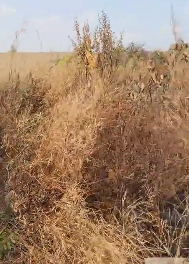 A man is standing next to a small cinder block wall, holding a phone. He is wearing a light blue shirt and black pants. The surrounding area is a dry field with tall, brown grass. The sky is overcast. The camera pans to show the surrounding area, which includes more dry grass, sand piles, and a partial view of what appears to be an unfinished building in the distance. The ground is mostly red dirt.