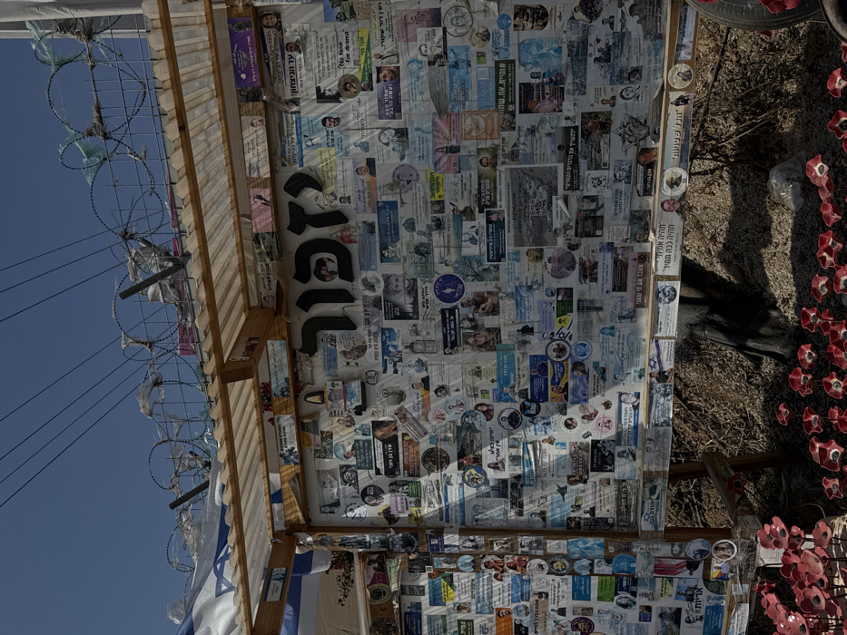 The image displays an outdoor memorial structure located in the Sdot Negev Regional Council, Israel. The primary element is a large, vertical panel within a wooden frame, topped by a translucent corrugated plastic roof panel. This panel is extensively covered with numerous printed papers, photographs, and stickers, predominantly featuring individual portraits and accompanying Hebrew text, indicative of memorial notices. A prominent, large black Hebrew word, "יזכור" (Yizkor), meaning "Remember," is affixed near the top center of the display. Above the structure, coiled barbed wire is strung horizontally, with some plastic debris entangled within. A blue and white Israeli flag is partially visible on the upper left side, draped over the wooden frame. Utility lines are visible against the clear blue sky. At the base of the display, the dry ground, covered in reddish-brown earth and sparse vegetation, extends into the foreground. Numerous artificial red flowers, resembling poppies, are arranged in rows across the ground. The scene is illuminated by direct sunlight, casting shadows. No individuals are present in the depicted area.