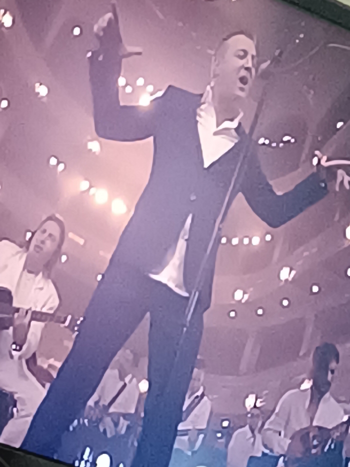 - "A male vocalist, centrally positioned, sings into a microphone on a stand, with his mouth open and both arms raised" by FM-iHa0r2, licensed under CC BY 4.0