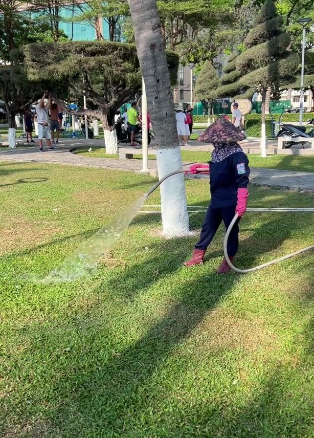 A person in a dark uniform, covered face, pink gloves and boots is watering grass near a tree in a park. They are using a white hose and the grass is green. Other people can be seen in the background walking and standing around. There are trees and buildings in the background, as well as a parked motorcycle. It is daytime.