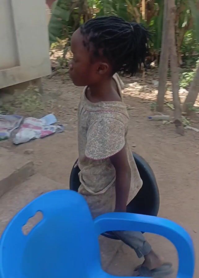 young girl with braided hair carrying a large black bucket, walking towards a building. In the background, another child carries a bucket on their head. An adult woman also carries a container on her head as she walks on the steps of the building. Several children are around the steps, and there are buckets filled with what appears to be corn kernels. The environment seems to be a yard with trees and a building in the background.