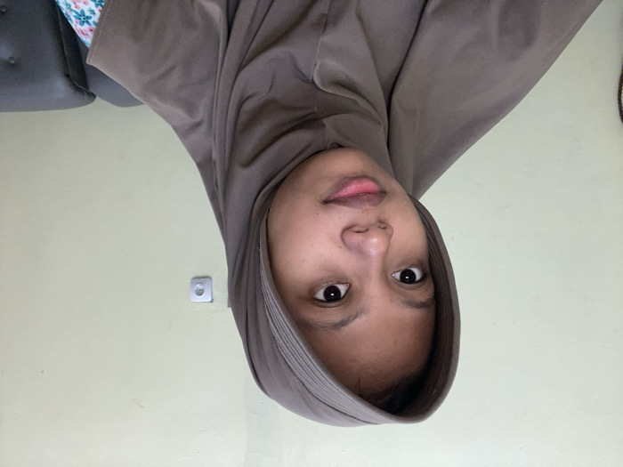 A young adult female is depicted from the upper chest upward, looking directly at the camera with a neutral expression. She has light brown skin, dark eyes, and is wearing a plain, muted brown hijab that covers her head and neck, draping over her shoulders. A light-colored, possibly floral-patterned garment is visible beneath the hijab on the lower left side of the frame. The background consists of a plain, light beige wall. To the right of the subject, a white rectangular electrical outlet with two circular sockets is affixed to the wall. The upper portion of a dark grey or black upholstered furniture piece, likely a couch or chair, is visible in the lower right corner of the image. The scene is located indoors in Gadingrejo, Indonesia.