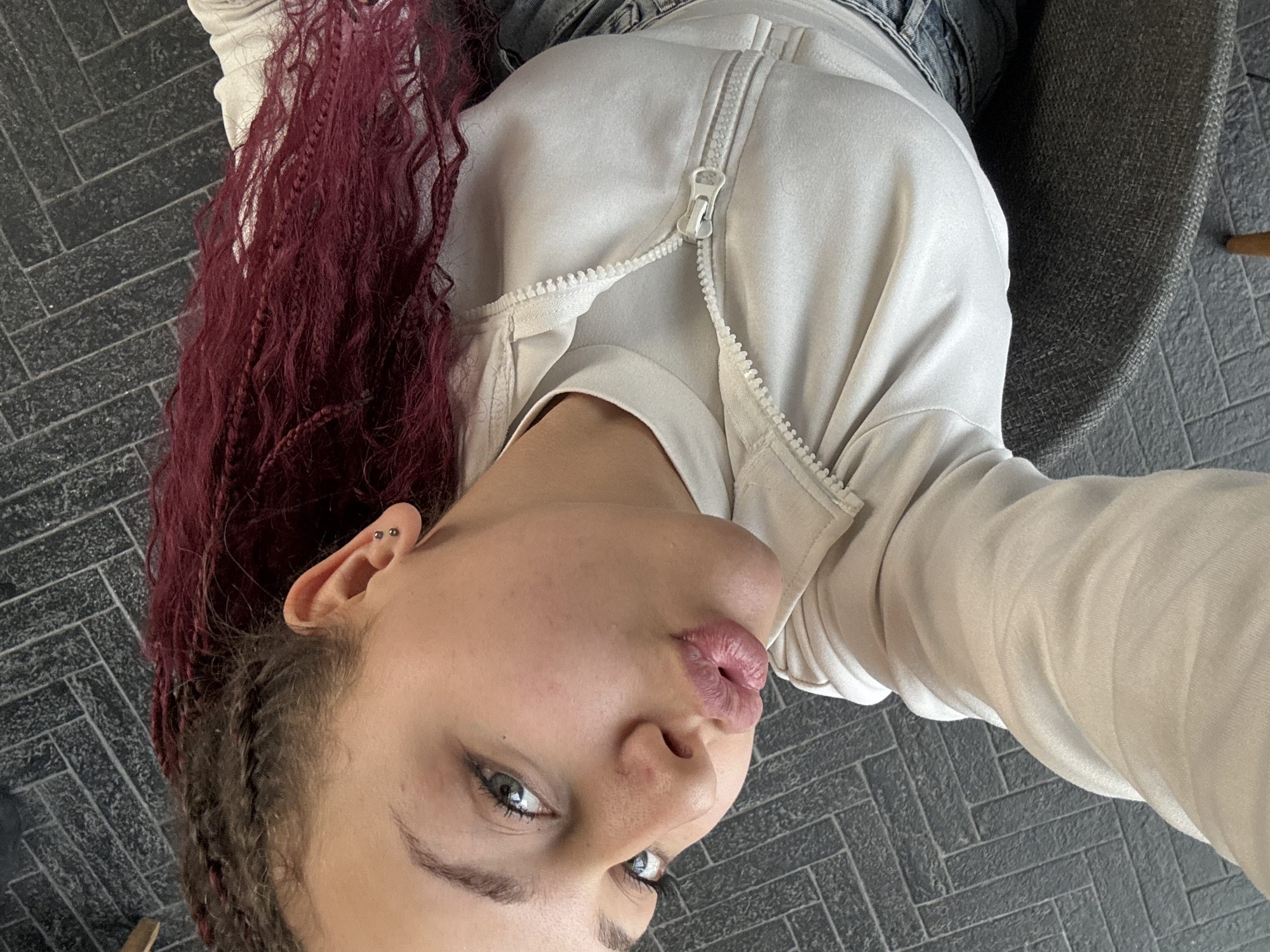 A medium shot depicts a person with braided, maroon-colored hair wearing a light-colored zip-up jacket, seated in a grey chair atop a herringbone-patterned floor. The individual has fair skin, visible ear piercings, and is looking upwards towards the camera. The location is likely indoors given the flooring and furniture, but there are no definitive landmarks to establish the exact location within the city of Varna, Bulgaria.