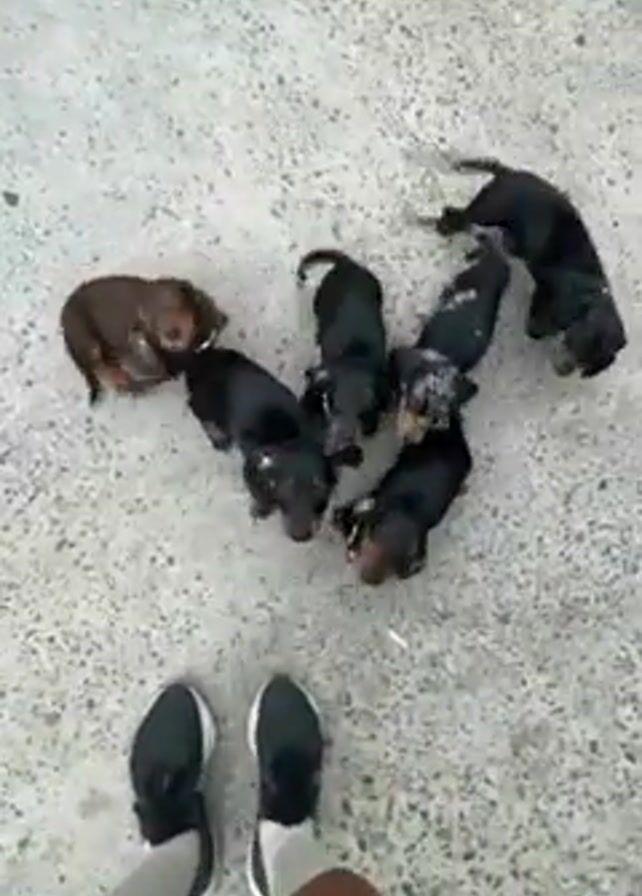 The camera shows a person standing on a concrete surface, and a group of seven dachshund puppies are gathered around the person's feet