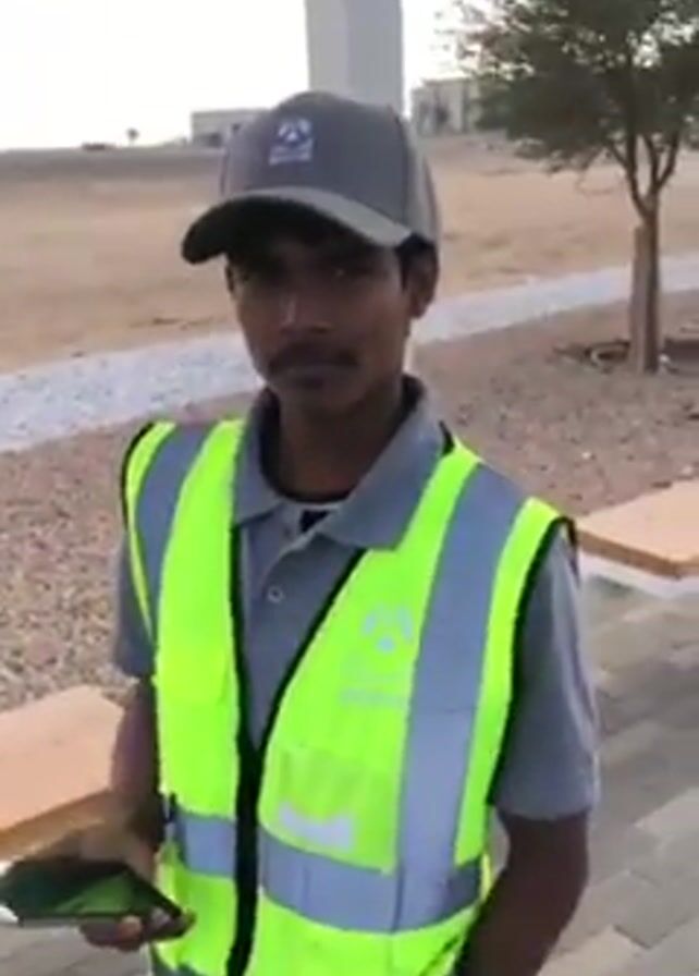 A young man stands outside, smiling, and briefly speaks to the camera. He is wearing a gray collared shirt, a bright green safety vest, and a gray baseball cap. The vest has the logo of "amrak" on the right side. He is holding a smartphone in his left hand. The background includes a light-colored brick sidewalk, a wooden bench, a beige gravel area, a light-colored building in the distance, and a tall, slender white structure.