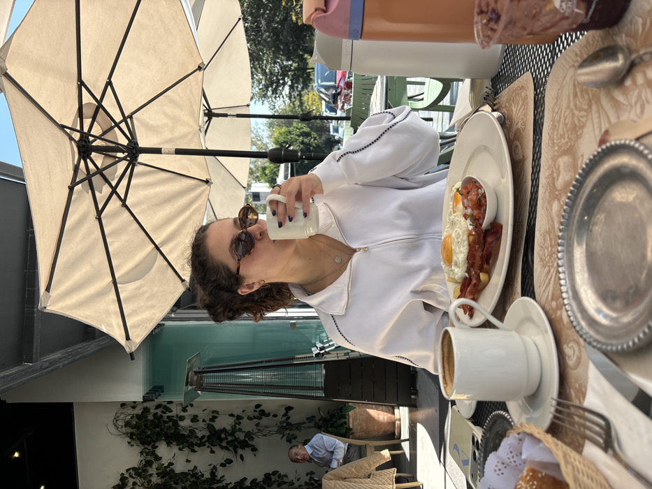 A person in sunglasses drinks from a mug at an outdoor table under an umbrella. A plate with eggs, bacon, and salsa sits nearby, along with a cup of coffee, utensils, and a bread basket. A man is seated further back. The background includes greenery, a glass panel, and a partial view of other tables and buildings. The overall setting suggests a casual outdoor dining experience.