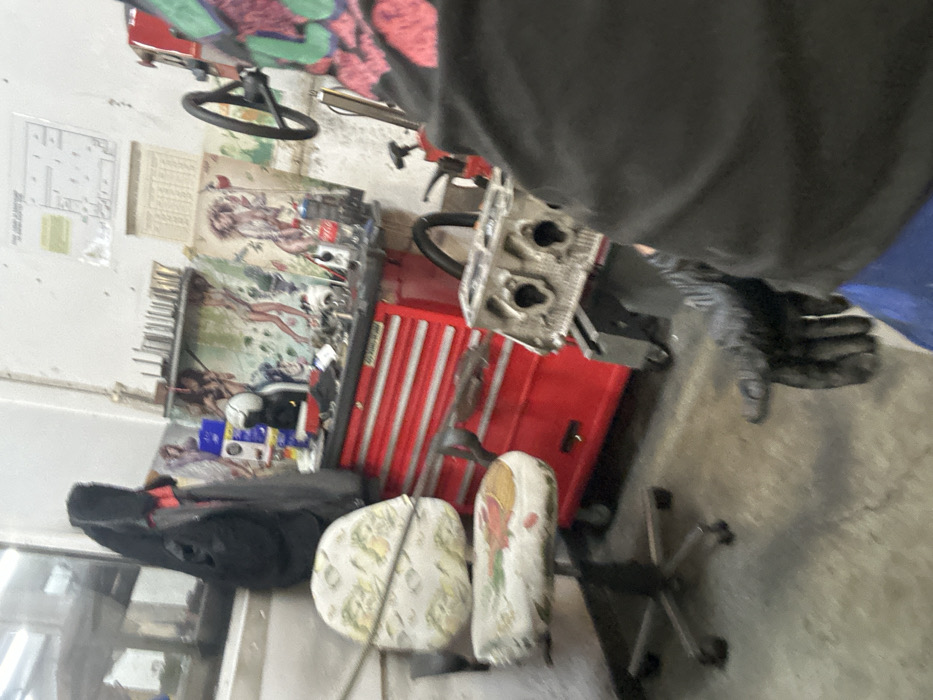 The image depicts an indoor workshop or garage environment. A single individual is partially visible from the back and right side, wearing a dark hooded garment with colorful patterns on the hood and black work gloves. Their gloved right hand is extended. In the central foreground, a metallic engine cylinder head with two prominent circular ports is positioned on a stand. To the left, a five-wheeled office-style chair with a light-colored, patterned fabric upholstery, featuring a fruit-like motif on its seat, rests on a concrete floor exhibiting cracks and stains. In the background, a red multi-drawer tool cabinet serves as a workbench, supporting various tools, small parts, and a Coca-Cola bottle. The white wall above the cabinet displays several items: a rack of slender tools, two large posters featuring stylized female figures, and multiple documents, one appearing as a grid-like diagram or floor plan. A dark jacket hangs on a hook to the far left, near what appears to be a window or reflective surface. A steering wheel is visible hanging on the wall to the right. The specific location within Varna, Bulgaria, is not discernible from the visual information provided.