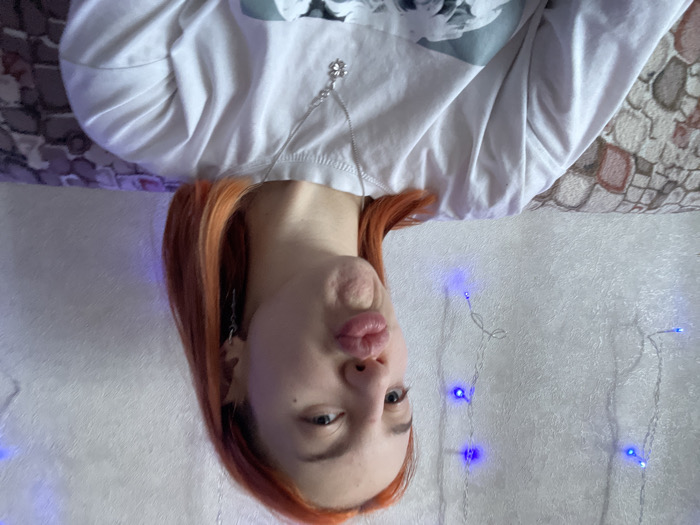 The image depicts a female subject from the chest up, situated indoors in Engels, Russia. She possesses shoulder-length, orange-hued hair and wears a white long-sleeved t-shirt with a graphic design, a silver-toned necklace featuring a four-leaf clover pendant, and a silver-toned dangle earring on her visible left ear. Her lips are conspicuously pursed, and her gaze is directed slightly upward and left. The background consists of a light-colored, textured wall adorned with vertically strung blue LED fairy lights. A segment of patterned upholstered furniture, exhibiting a geometric or abstract design in muted tones, is visible on the lower left.