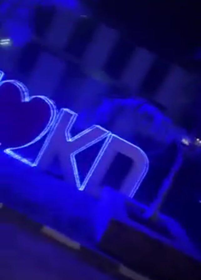 n illuminated sign that reads "I love TXD". The sign is outlined in bright blue light and the letters are white. The video is shaky and taken at night. The background is dark with some vegetation visible.