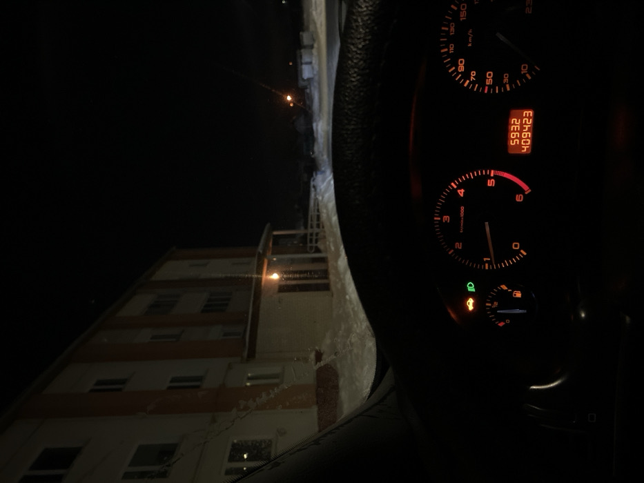 A low-angle view from inside a car at night shows a building with multiple floors and windows lit by streetlights. The car's dashboard is visible, featuring illuminated gauges including a speedometer, tachometer registering 1600 RPM, a fuel gauge nearing empty, and an odometer reading 40942.3 kilometers. The interior of the car is dark, contrasting with the dimly lit exterior scene.