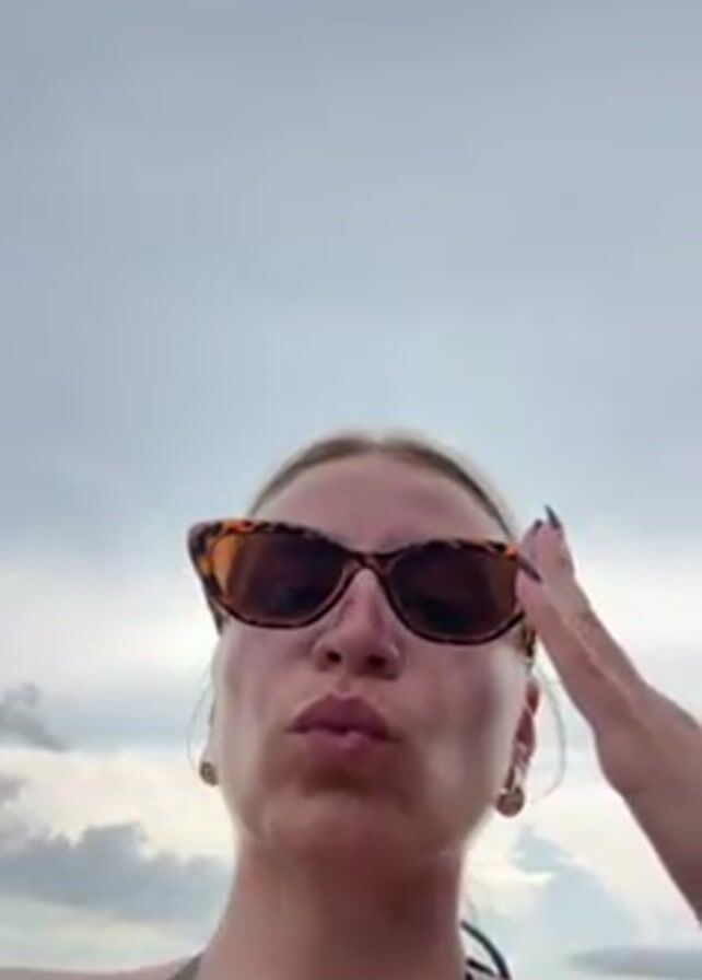 A woman with blonde hair is looking down at the camera with a cloudy sky in the background. She is wearing sunglasses and a black top. She purses her lips and raises her hand to her head.