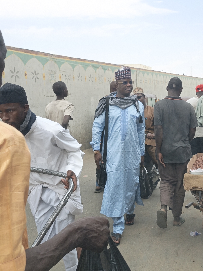 This image depicts a pedestrian scene in Fagge C, Nigeria, under an overcast sky