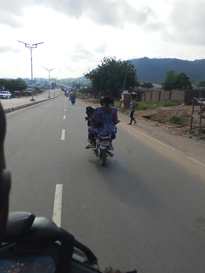 A road stretches into the distance, flanked by streetlights. A motorcycle with two passengers rides ahead. Another motorcycle appears farther down the road. A person walks on the roadside carrying something on their head. Beyond the roadside, there is a wall, some vegetation, and a hill in the background. A portion of another motorcycle and the driver's hands are visible in the foreground. The sky is overcast.