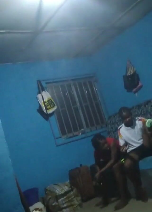 In a dimly lit room with blue walls and a pale ceiling, two people are visible. One individual in a red shirt is seated, while another person in a white shirt with dark shorts sits beside them on a couch or bench. The person in the white shirt appears to be holding something green in their hand. The room contains several bags, one by the window and another near the floor, along with a broom-like object standing in the corner. A window with bars is present, and light is coming from an overhead source. A dark bag also hangs on the wall. The person in the white shirt stands up and walks in place for a moment.