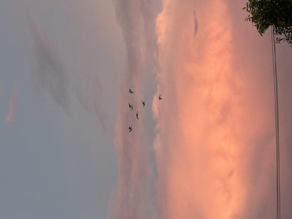 The image depicts a sky scene over Lhokseumawe, Indonesia, during either sunrise or sunset. The upper portion of the sky is a light blue, transitioning to a dominant orange-pink coloration across the mid and lower sections due to atmospheric light. Scattered clouds are present, with the lower clouds exhibiting strong orange-pink illumination. Seven birds are visible in flight across the middle section of the frame, silhouetted against the brighter sky and clouds, generally moving from left to right. In the lower portion of the image, three parallel horizontal lines, consistent with utility wires or power lines, traverse the frame. The silhouette of a tree or shrub with visible foliage is present in the bottom right corner. No human figures are present.