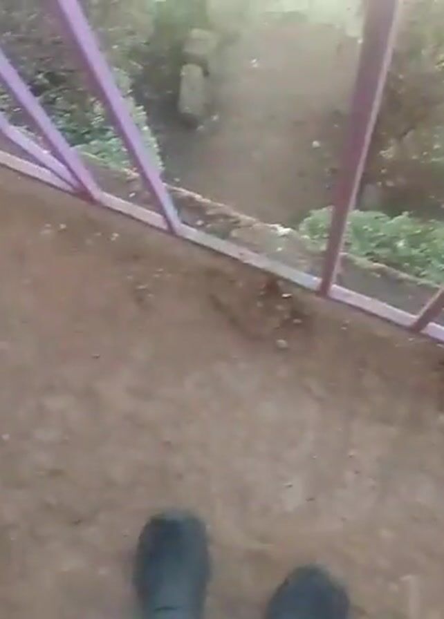 person standing on a balcony, looking out at a field with buildings and people. The balcony has a purple metal railing. The person is wearing white pants and dark shoes. The field is brown with patches of green grass. There are several buildings with red roofs in the distance. There are also several people sitting in white chairs in a line. A silver car is parked on the edge of the field. The sky is blue with white clouds. The camera angle shifts occasionally, changing the view.