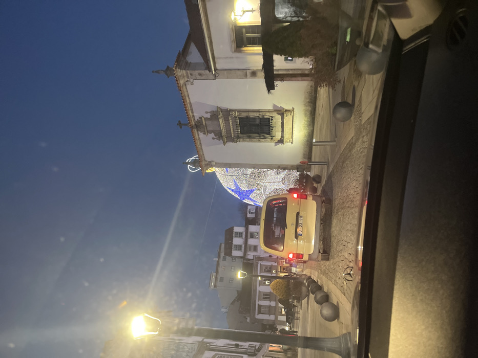From inside a vehicle, a street scene unfolds. A cream-colored van with the license plate "89 23 HI" is situated on a cobblestone street. Beside the van is a building adorned with intricate architectural details. A large, illuminated sphere with blue stars is visible in the background. Streetlights illuminate the street, which features spherical bollards along the curb. The sky is a dusky blue, indicating it is either early morning or late evening.