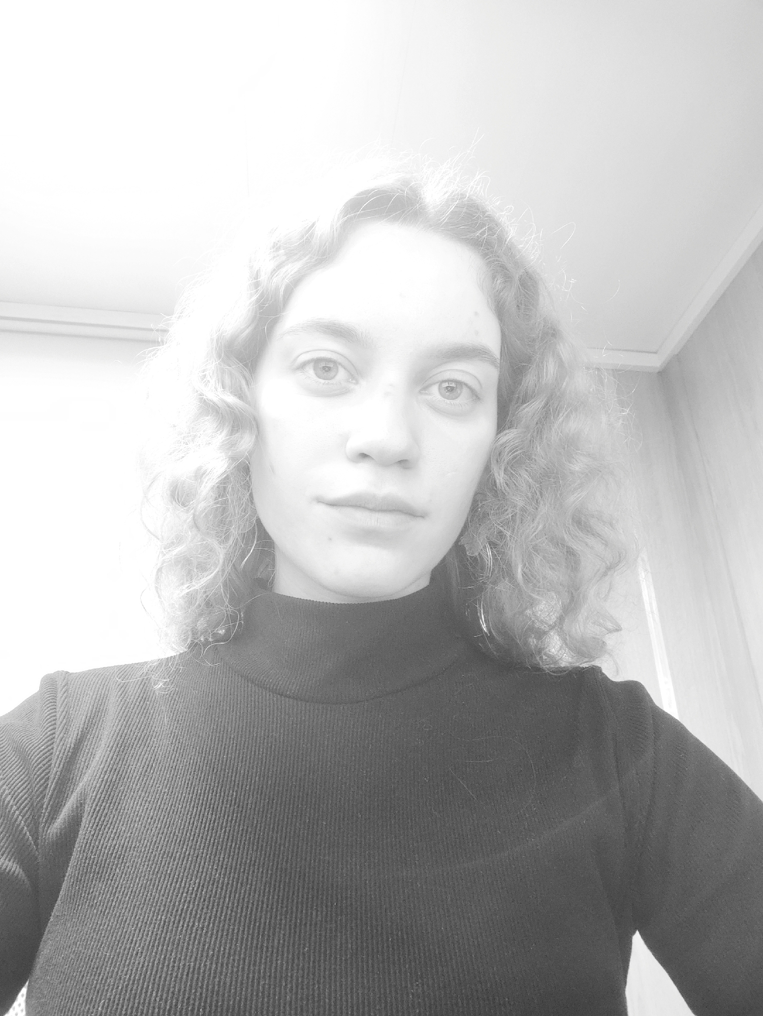 A close-up, grayscale, indoor photograph shows a young woman. She has light skin, a neutral expression, and light-colored curly hair that frames her face. She wears a black turtleneck shirt with a ribbed texture. The background is bright, suggesting strong lighting, and includes a ceiling and a wall with a paneled appearance on the right side. The location is Unknown, Unknown.