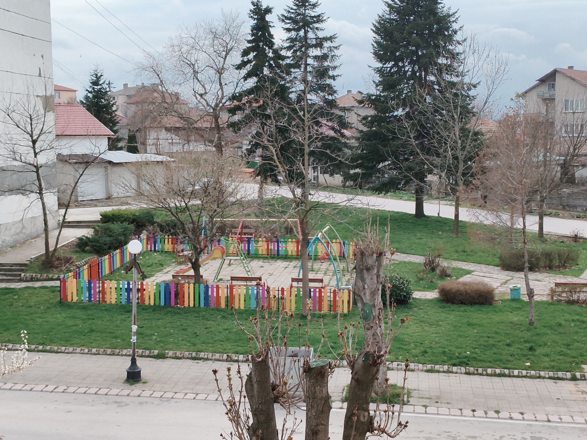 The image depicts a playground in the city of Tervel, Bulgaria. The playground is fenced with a colorful, vertical slat fence. Inside the fence, there are swings, a slide, and benches. A street lamp is positioned near the fence. The playground is surrounded by green grass and trees. Bare trees are present around the playground. Buildings are visible in the background, indicating the playground's location within a residential area. The overall view is from a slightly elevated position. In the immediate foreground are tree trunks.